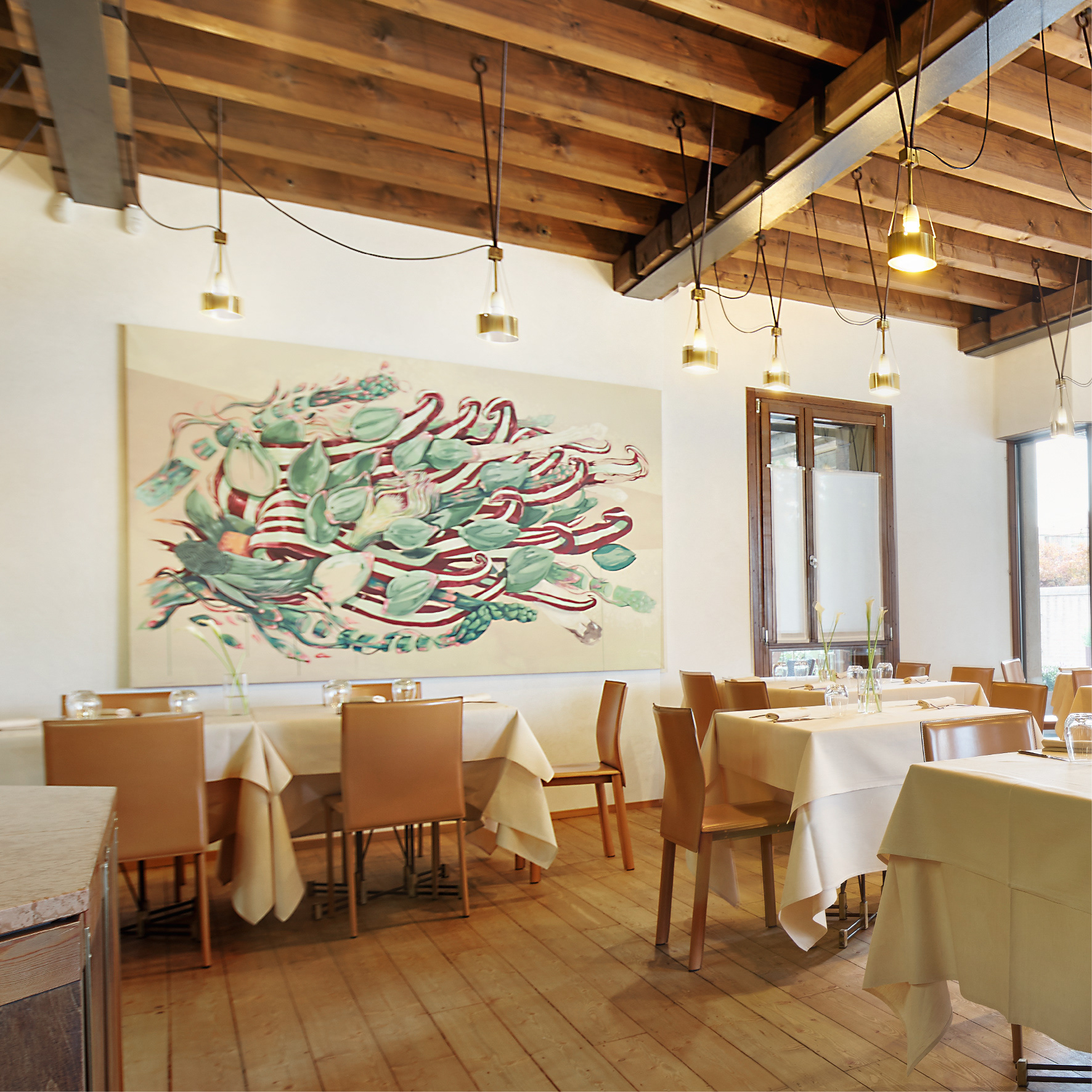 Il quadro nella sala principale è stato dipinto da David Sossella ed è un tributo ai sapori di questa terra: l'Asparago Bianco di Badoere IGP e il Radicchio Rosso di Treviso IGP.