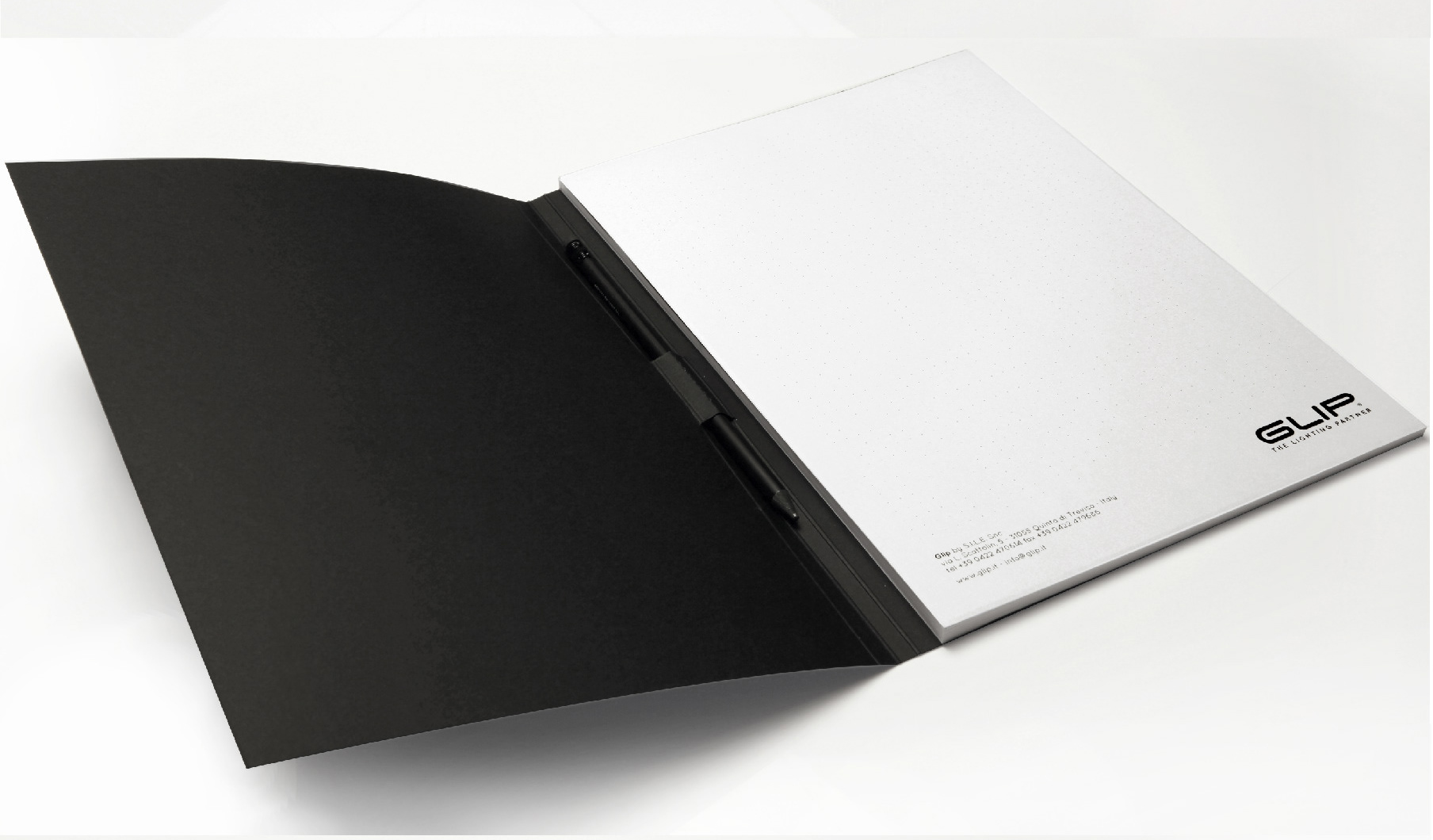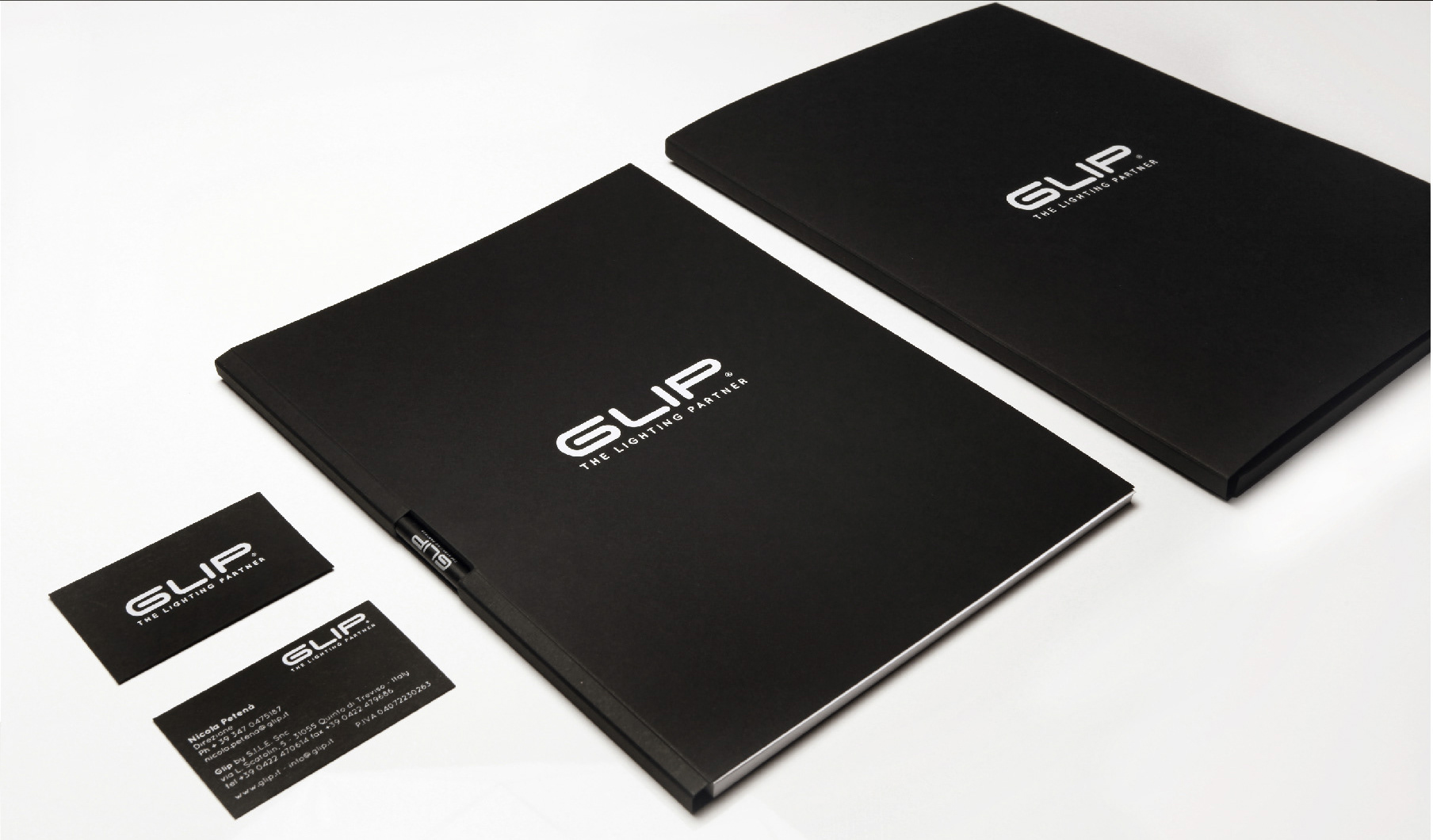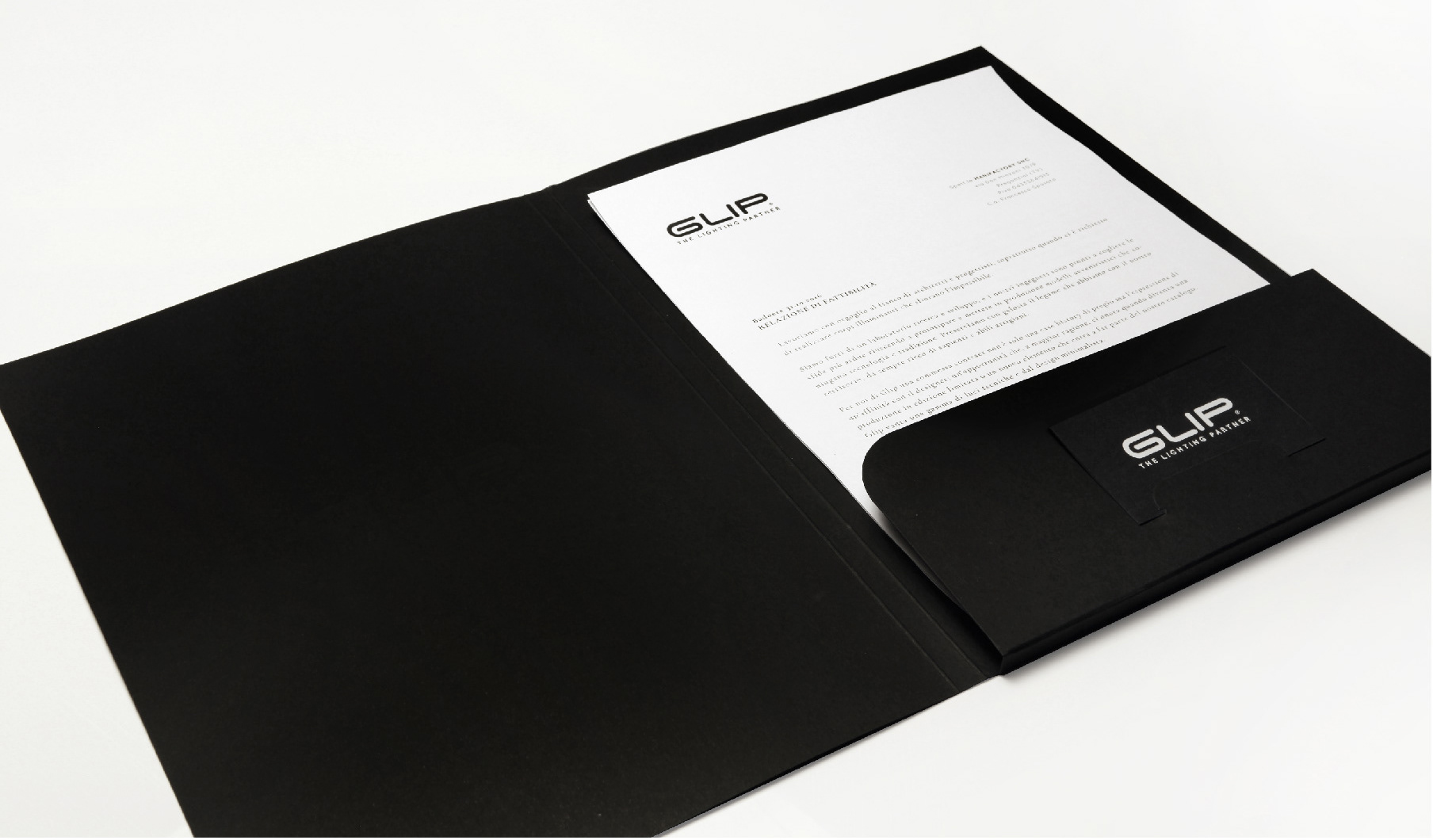 L'operazione di rebranding dell'immagine di Glip, azienda veneta specializzata nella realizzazione di progetti di illuminazione custom, è stata minimale ma significativa. Sono state corrette delle criticità nella forma e nell'accostamento delle lettere che compongono il logo Glip. È stato sostituito il font aziendale preferendo Quicksand che, con le sue forme rotonde, meglio si lega alla forma del logo Glip. Altrettanto semplice, tutt'altro che banale, è stata la produzione dell'intera immagine coordinata stampata su carta Favini Burano Nero Notte con grafica rigorosamente bianca ottenuta grazie ad una lamina bianca a caldo.