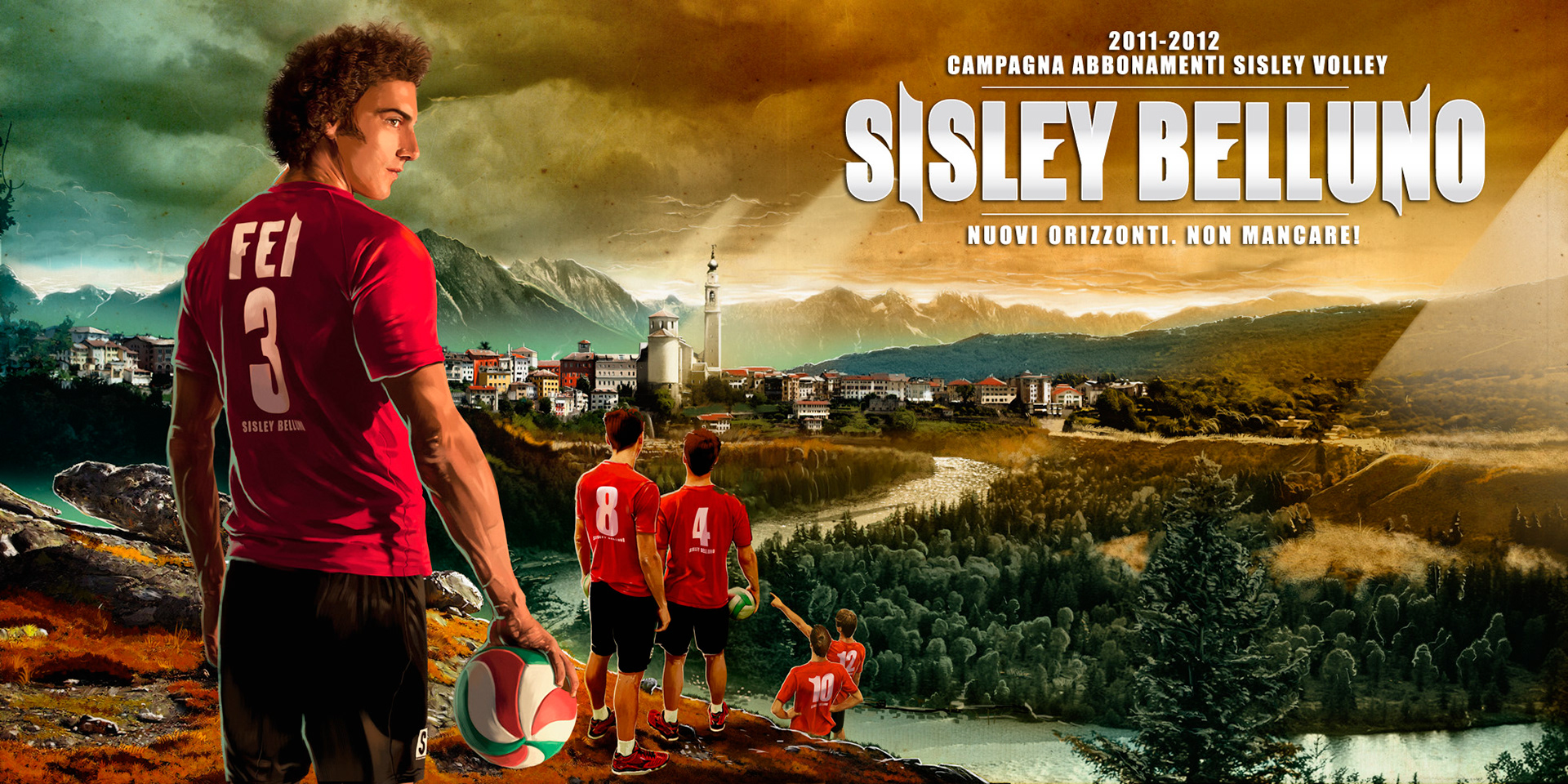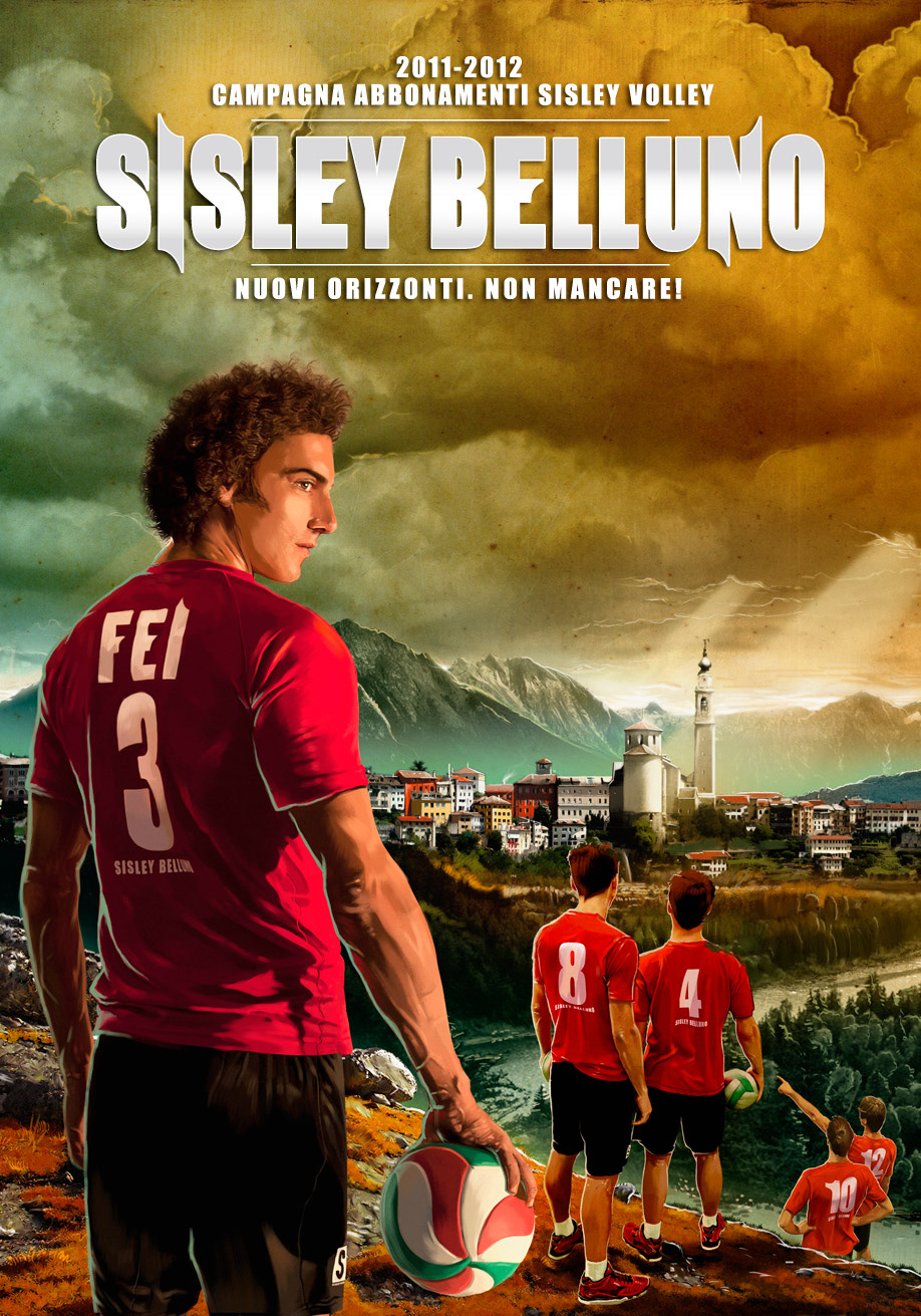The subscription campaign portrays the players of Sisley, with the Captain Fei in the foreground, who arrive in the valley of Belluno, between the Veneto's Dolomites. The city of Belluno, faithfully reproduced, welcomes the champions of Treviso becoming their new home.