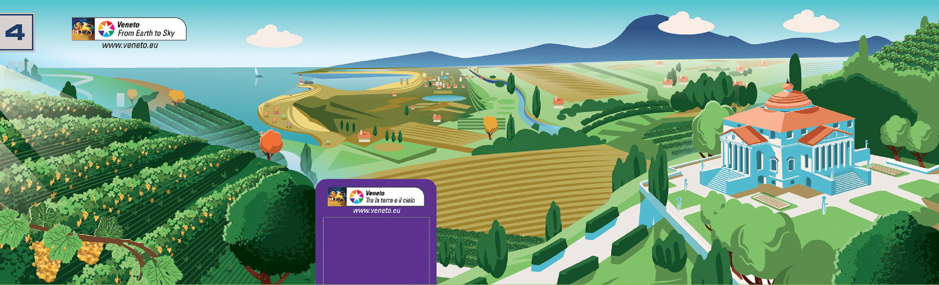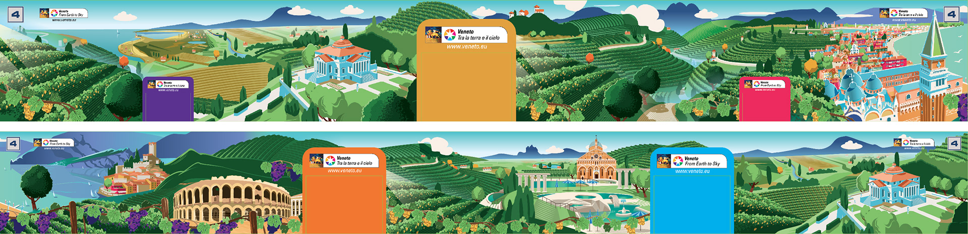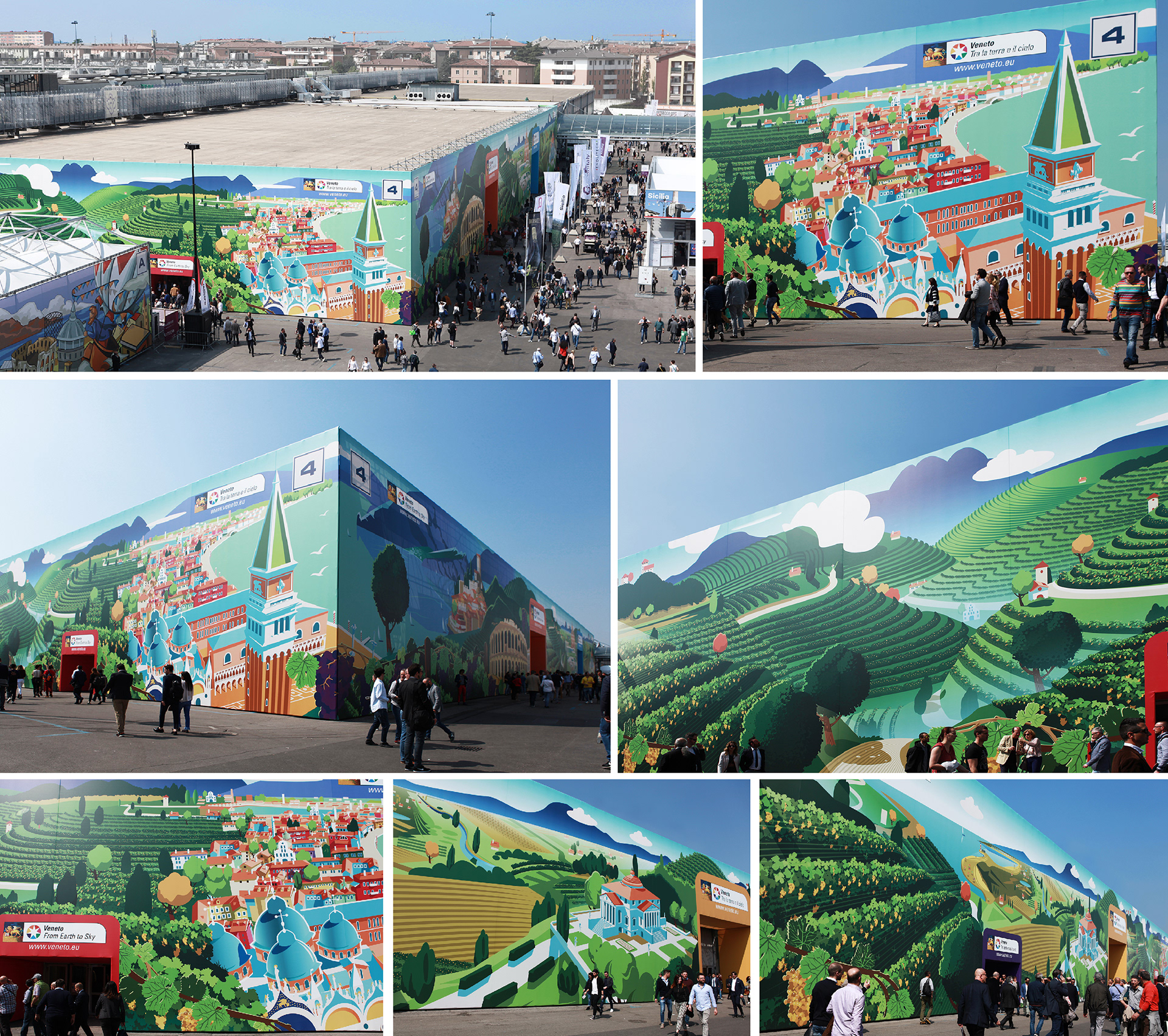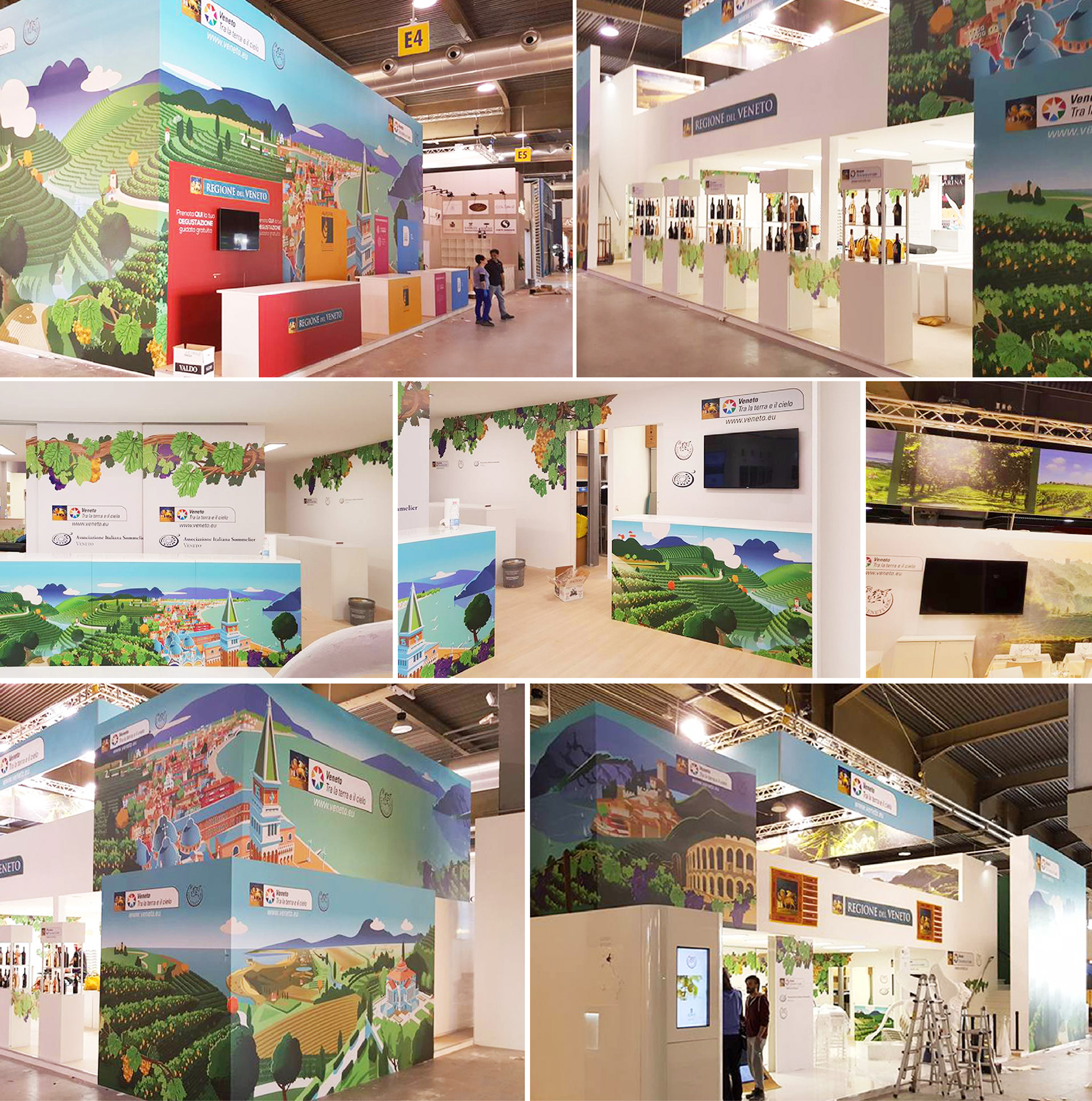 Thanks to this technique Sossella David could had drawn the illustration that winds for 1800mq of the pavilion length. Once again the beauty of the Veneto Region is the protagonist.
